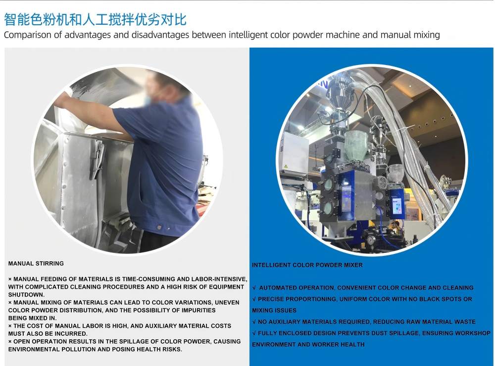 100 kg/h"Intelligent färgpulverblandning" kan sömlöst integreras med centraliserade matningssystem, centrala transportsystem och automatiska materialhanteringssystem. Plastic Color Mixer är utrustad med högprecisionsvägningssensorer, som säkerställer enhetligheten i blandningsprocessen och konsistensen av färgen, och stöder automatisk proportionering av flerkomponentpulver och tillsatser.